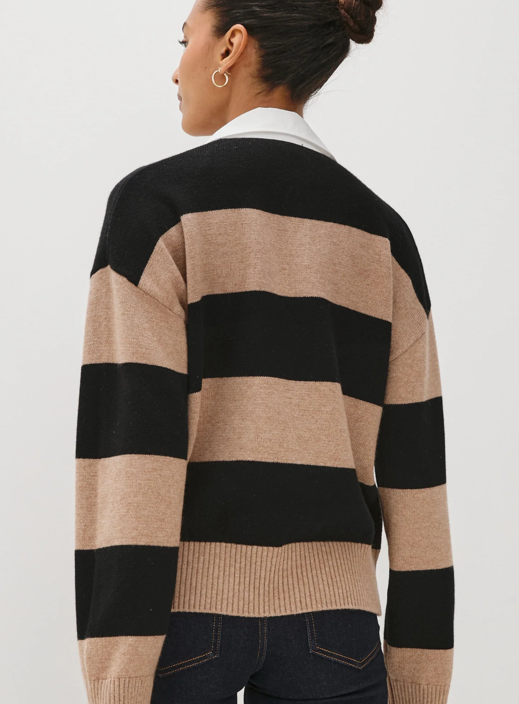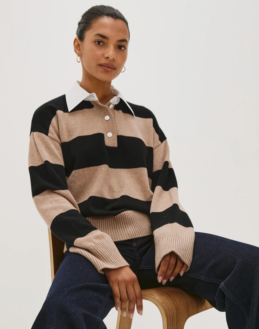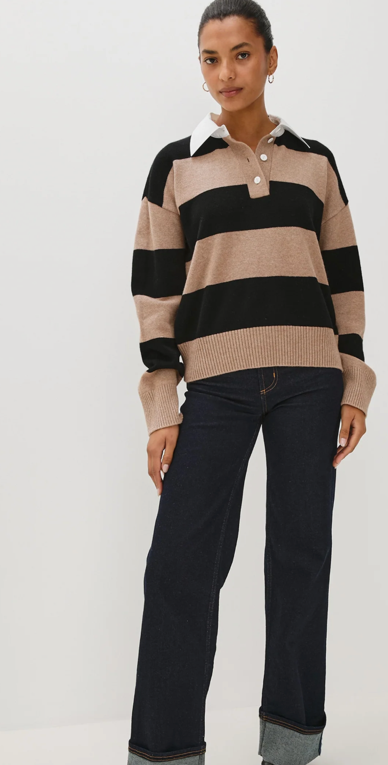 Regular price €238.00Rails Black/Tan Cotton/Wool Mix Stripe Top With Contrasting White Poplin Collar.
