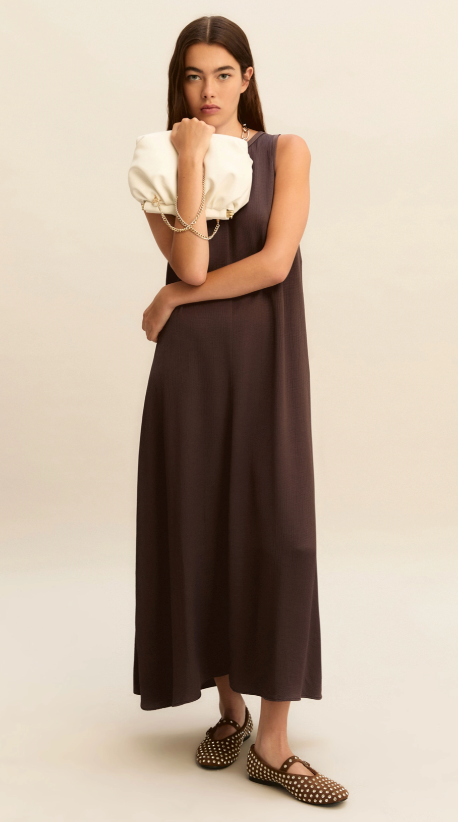 Regular price €220.00Emme Dark Brown/Grey Viscose Blend Sleeveless Long Flared Dress.