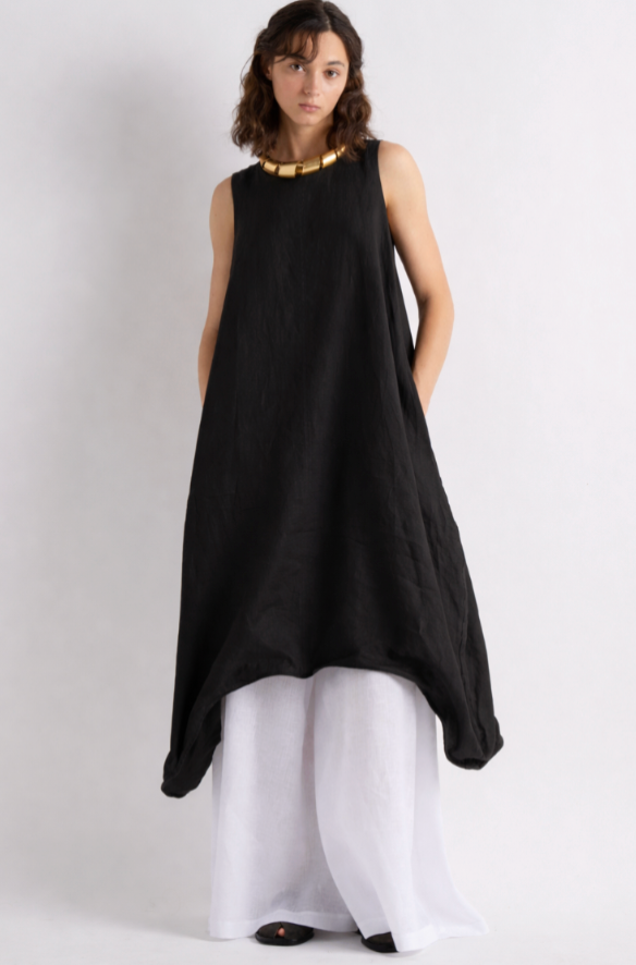 Regular price €260.00Meimeij Black Long Linen Sleeveless Dress With Wire Hem Detail.