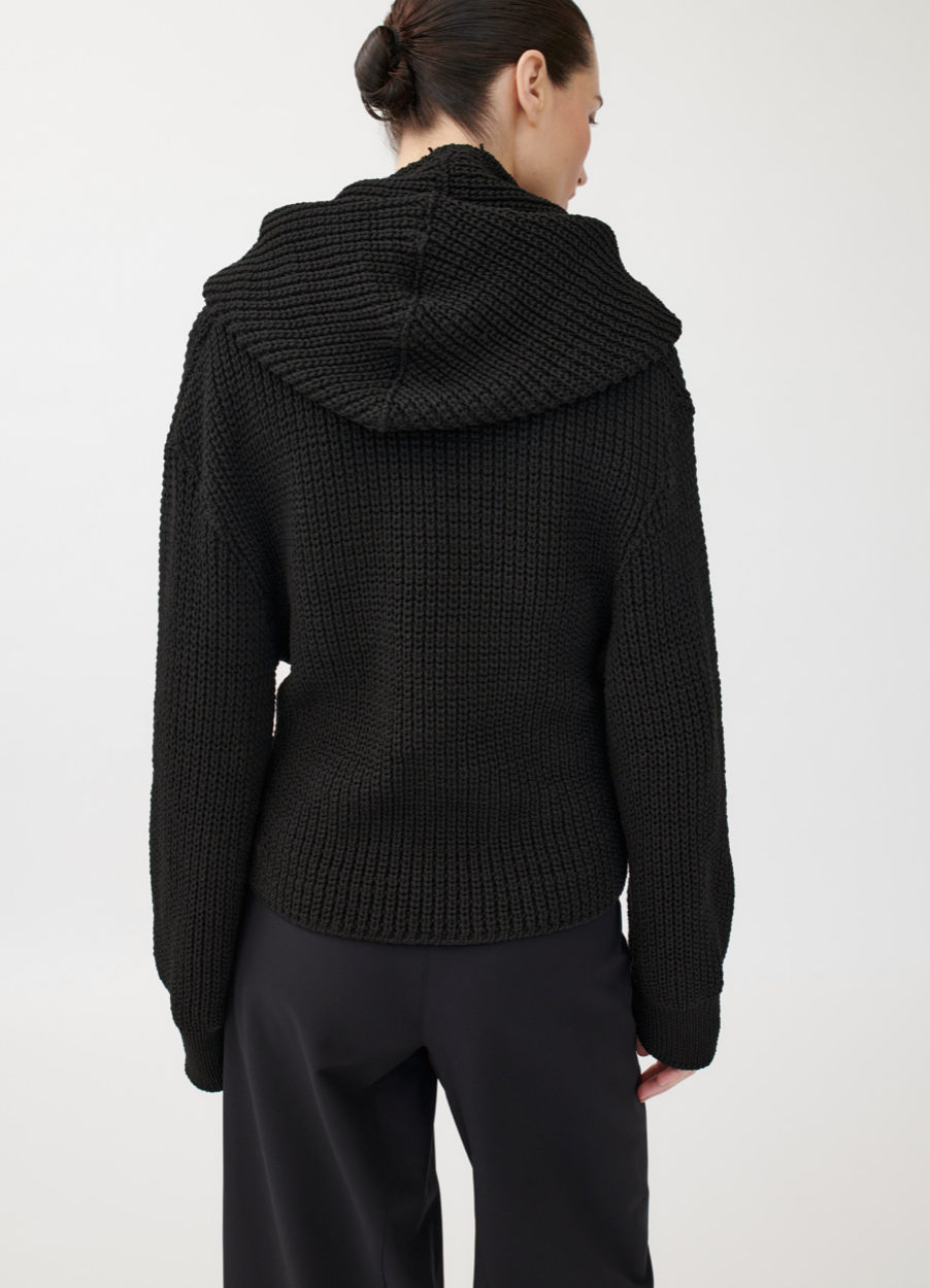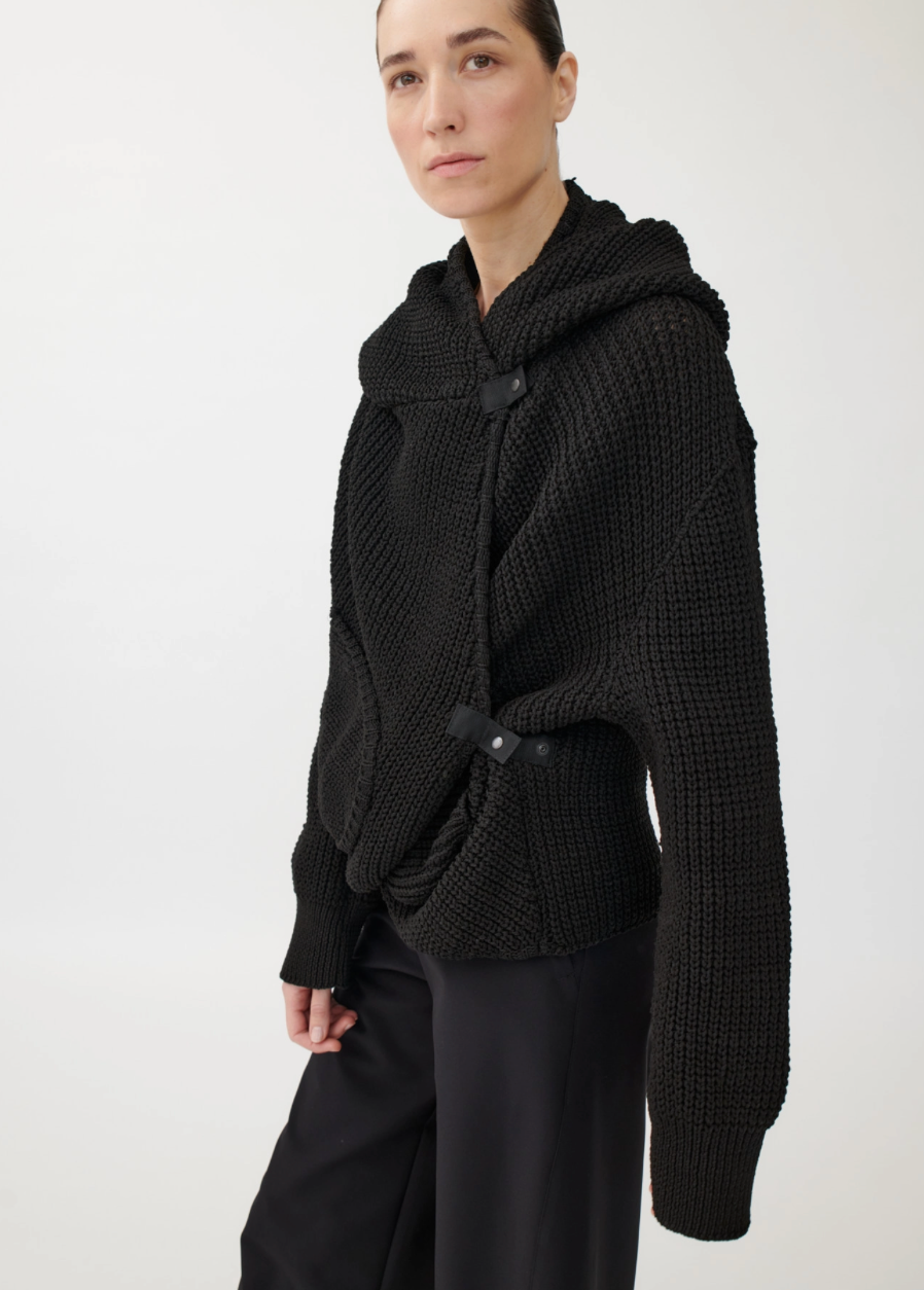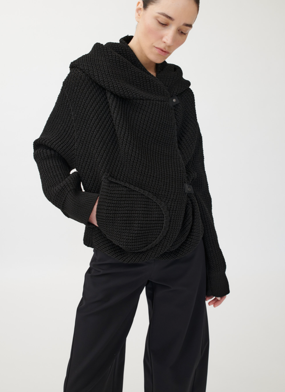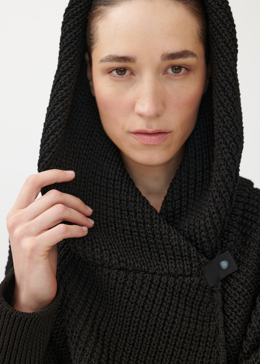 Regular price €599.00Annette Gortz Black Textured Seed Stitch Hooded Wrap Style Cardigan.