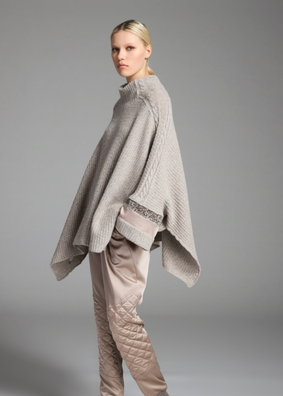 Regular price €360.00Tricot Chic Taupe Contrasting Knit Wool Blend Lurex Cape With Satin/Sequin Trim.