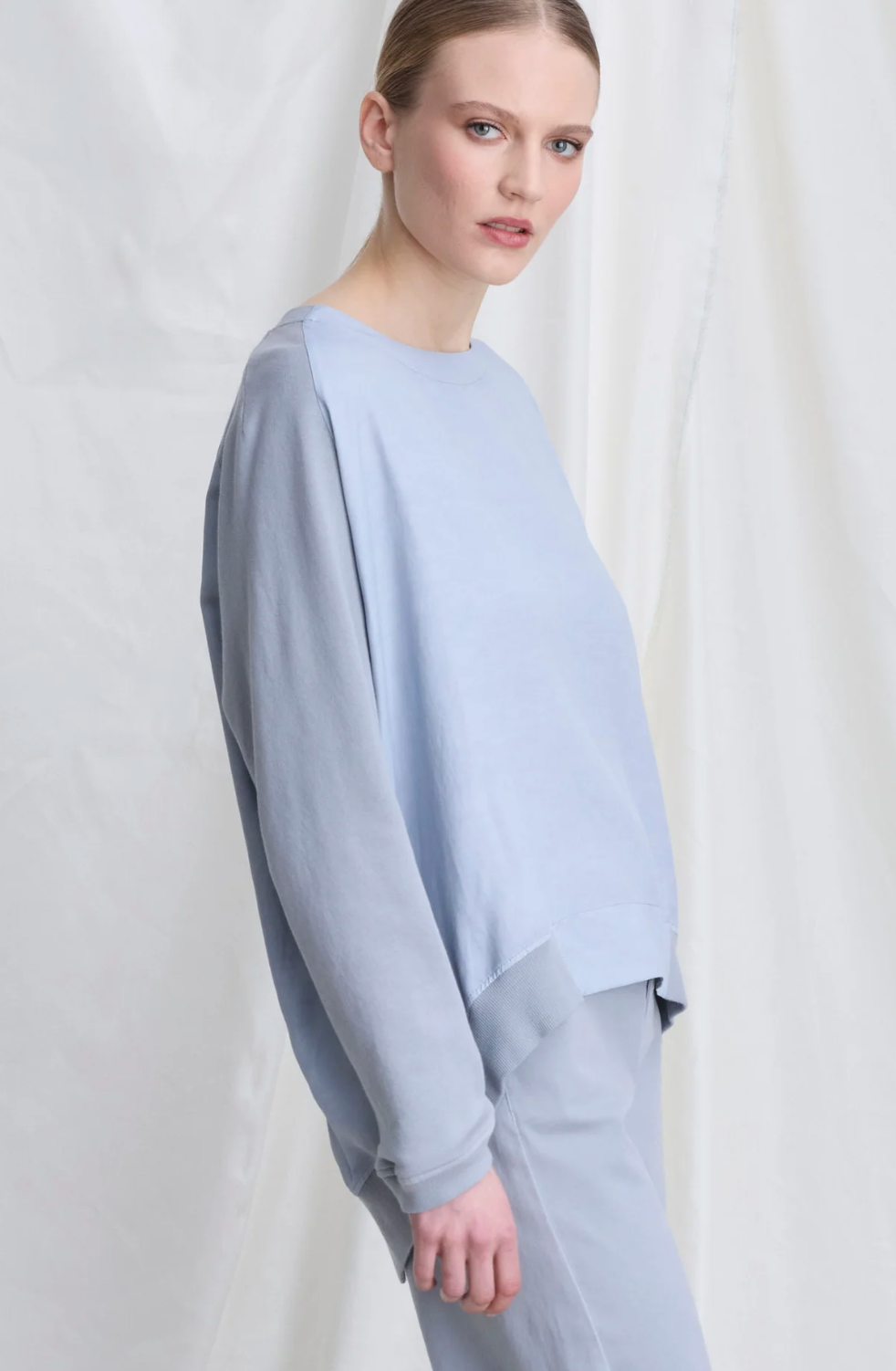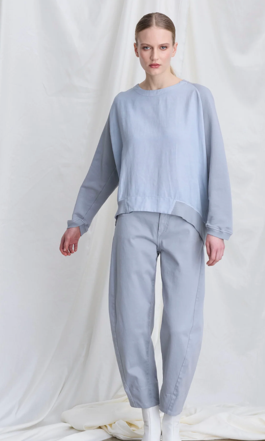 Regular price €205.00European Culture Ice Blue Soft Cotton Barrel Leg Pant.