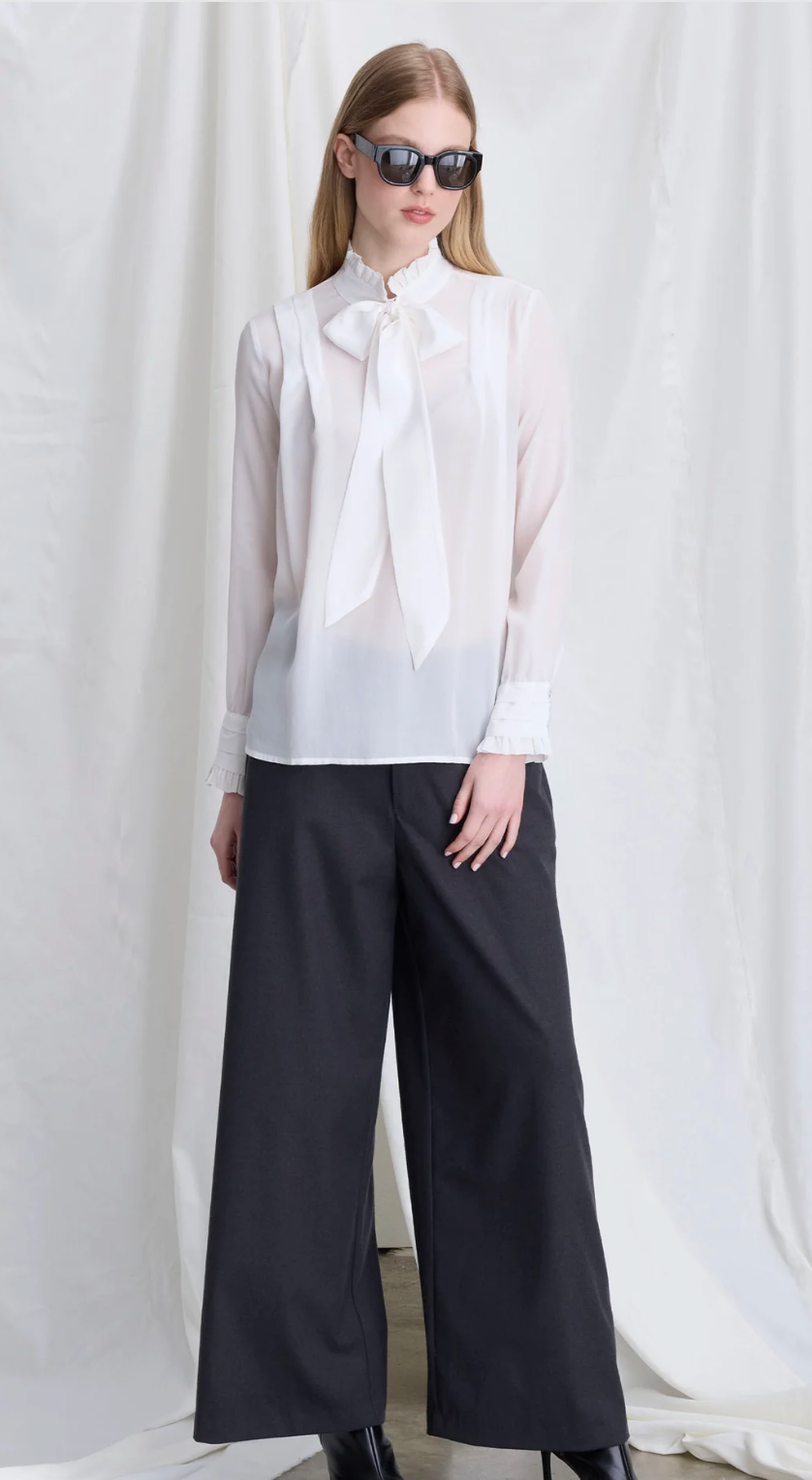 Regular price €270.00European Culture Winter White Sheer Fabric Frill Neck Blouse With Pleated Shoulder Detail.