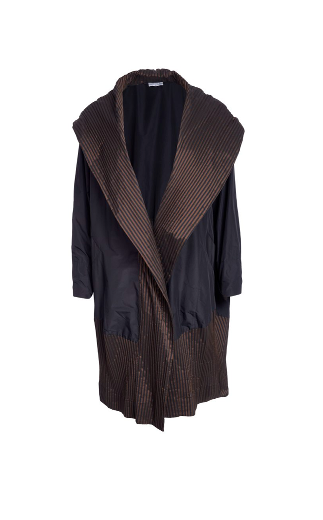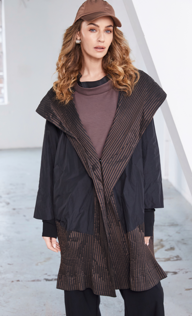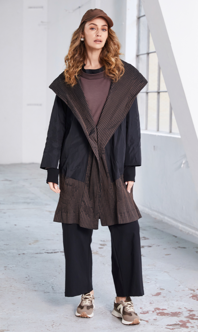 Regular price €240.00Naya Black Taffeta Long Line Stripe Jacket With Contrast Hem Hood/Collar.
