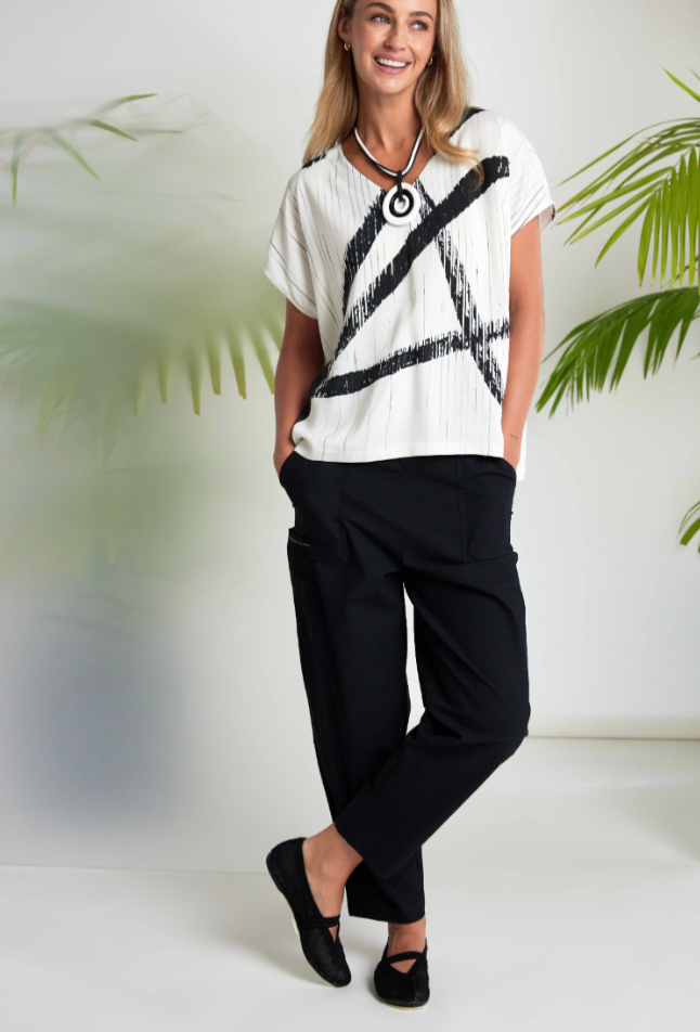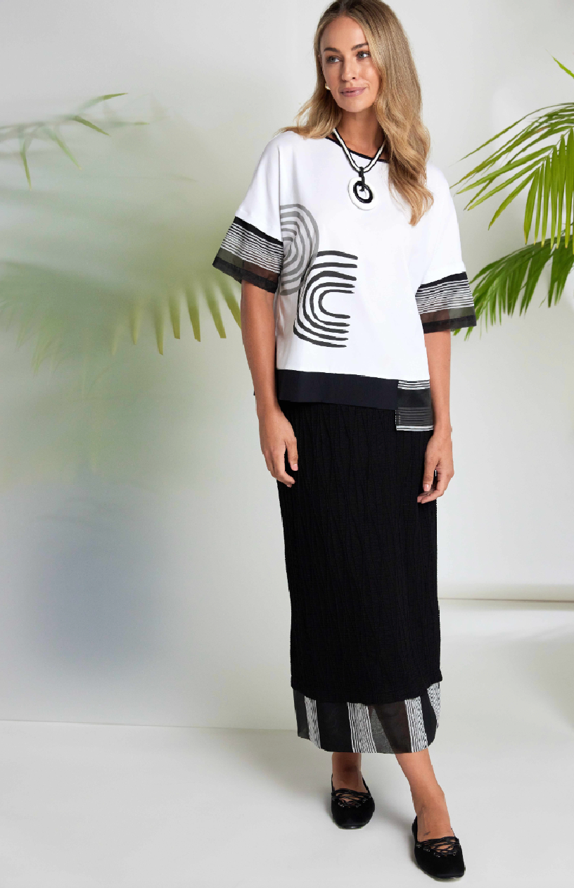 Regular price €150.00Naya White/Black Placement Print Short Sleeve Top With Stripe Hem/Cuff.