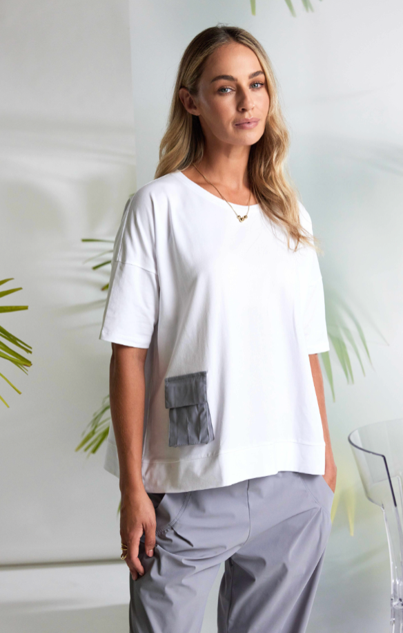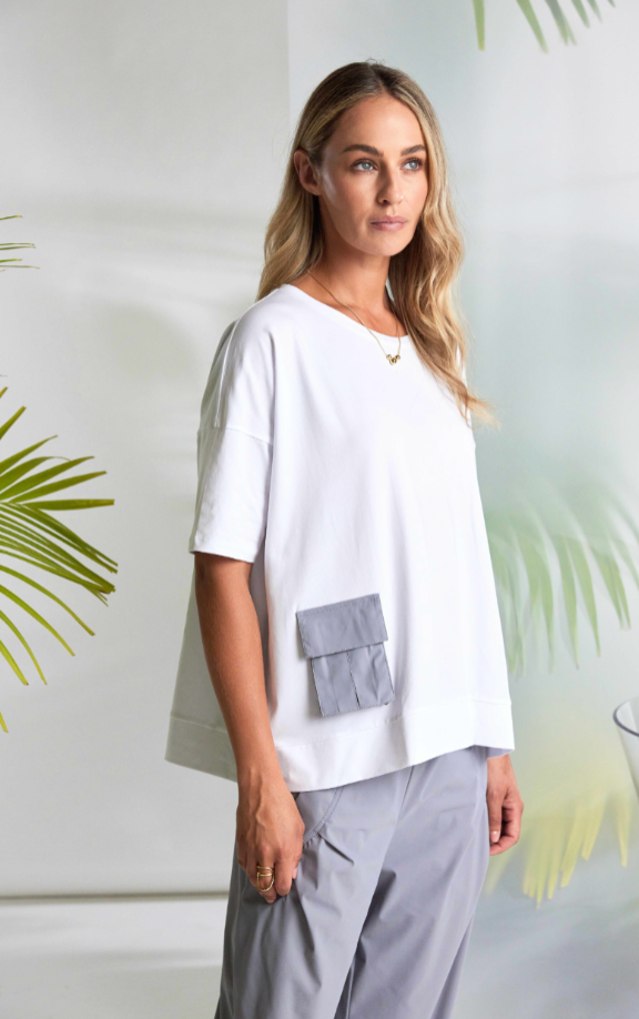 Regular price €99.00Naya White Cotton Round Neck Loose Fit Top With Contrast Fabric Dove Pockets.