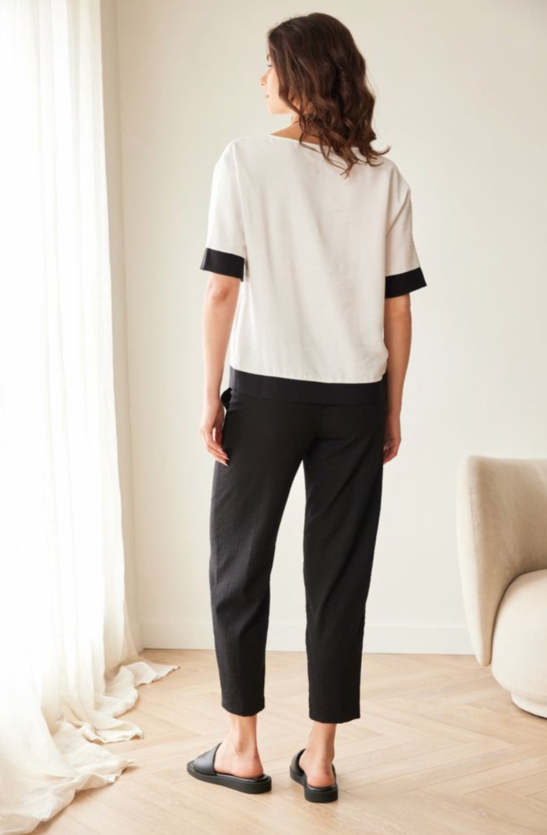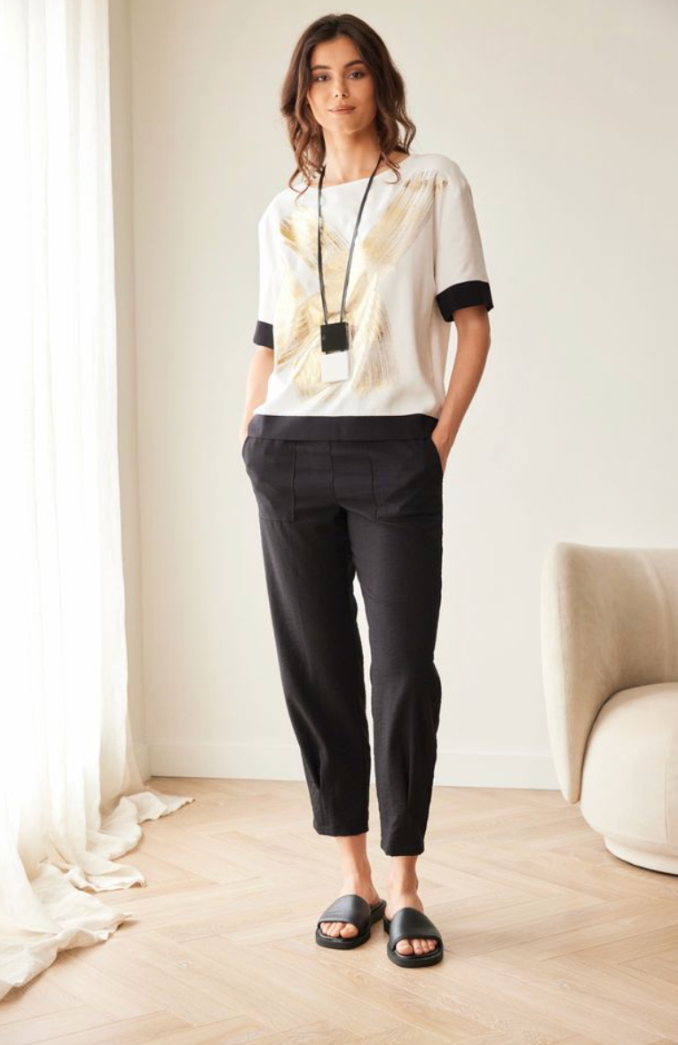 Regular price €115.00Peruzzi White/Gold Metallic Brush Short Sleeve Top With Black Cuff/Hem Trim.