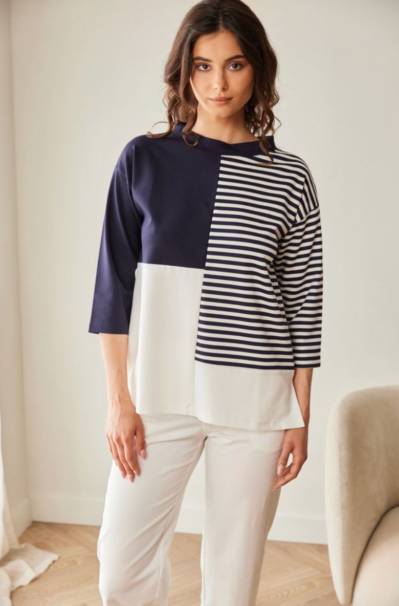Regular price €85.00Peruzzi Cream/Navy Stripe Jersey Fabric Top With 3/4 Length Sleeves.