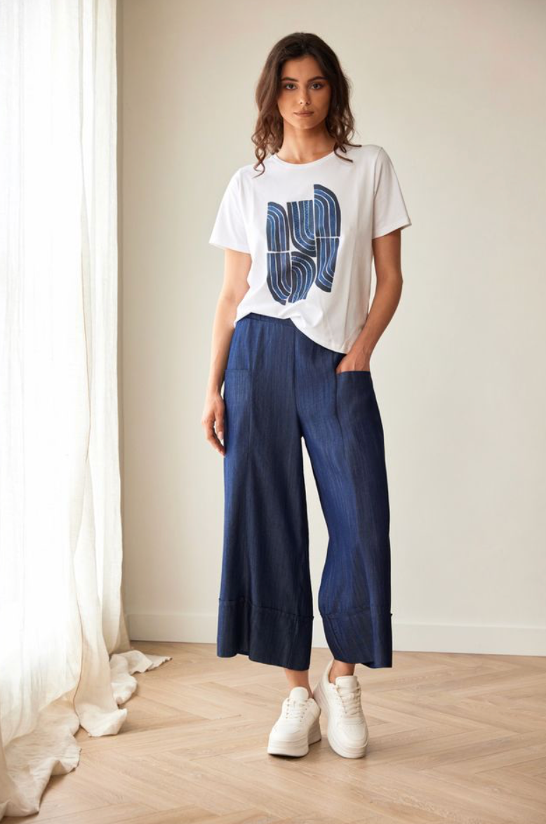 Regular price €115.00Peruzzi Denim Blue Lightweight Wide Leg Pant With Turn Up Hem.