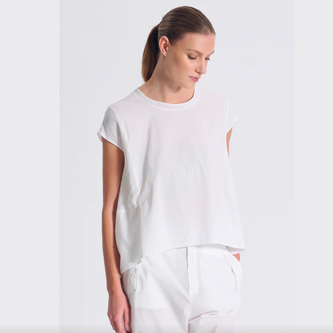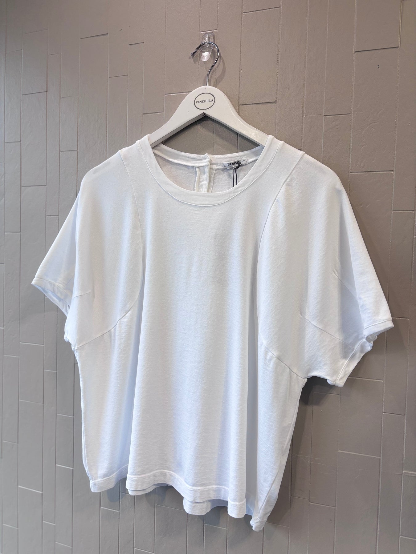 Regular price €195.00Transit White Poplin Stretch Cotton T-Shirt Top With Contrasting Viscose Trim.
