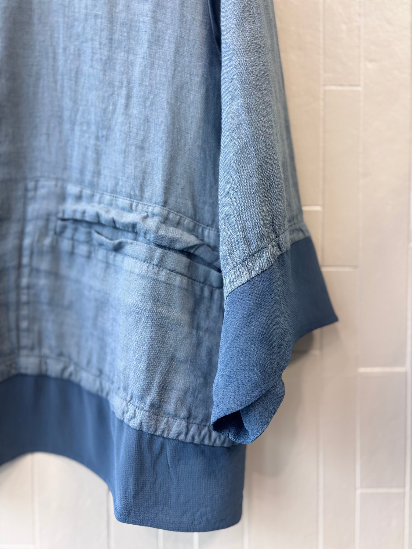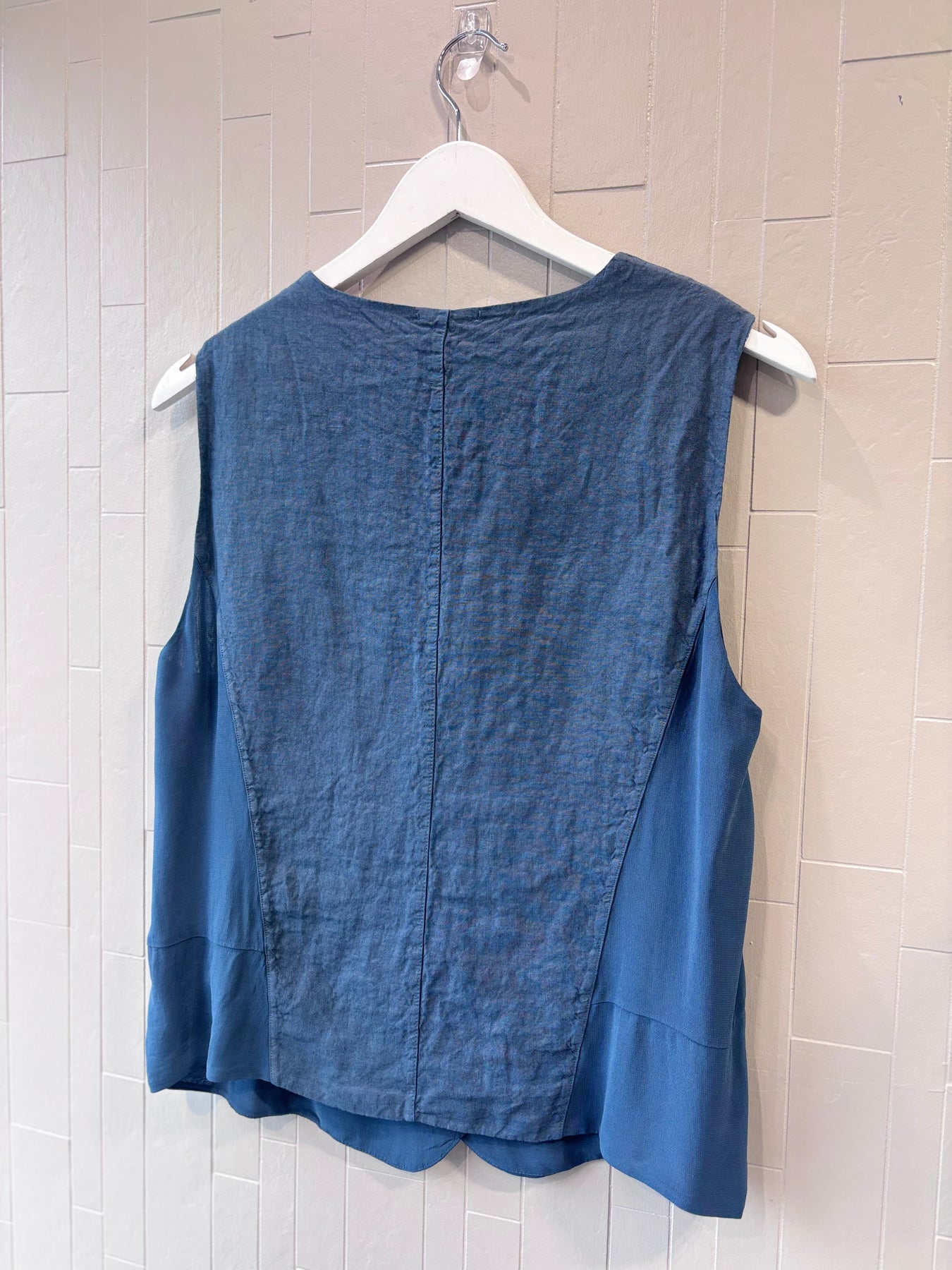 Regular price €245.00Transit Blue Slate Linen Double Breasted Waistcoat With Contrasting Fabric Detail.