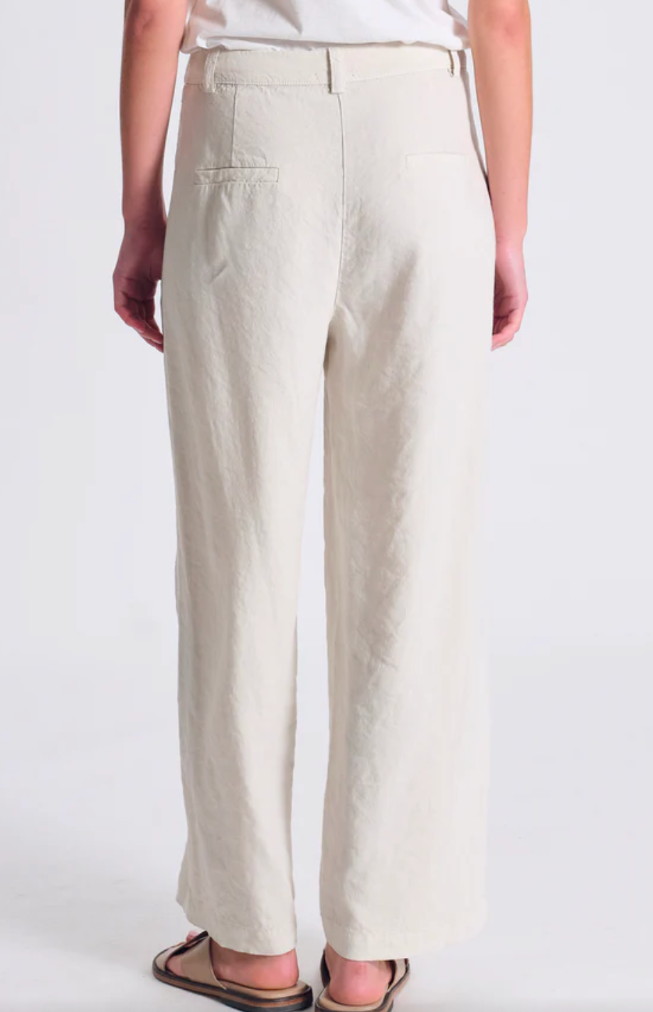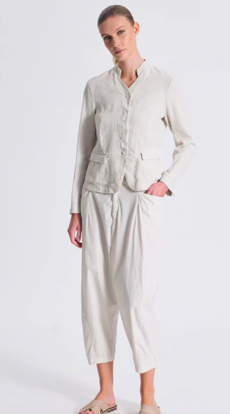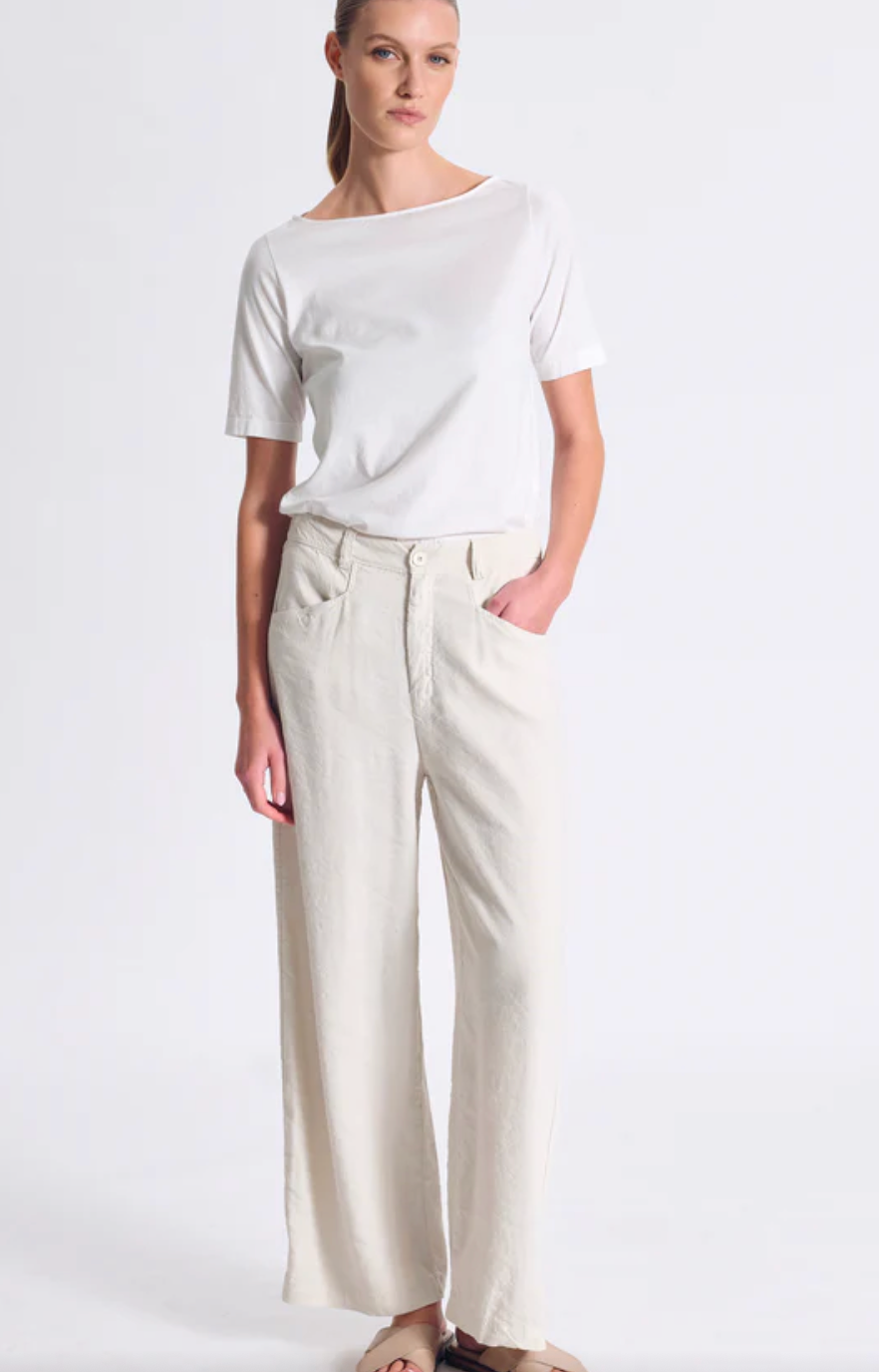 Regular price €298.00Transit Chalk 100% Linen Low Crotch Curved Leg Welt Flap Pocket Pant With Concealed Button Zip Detail.