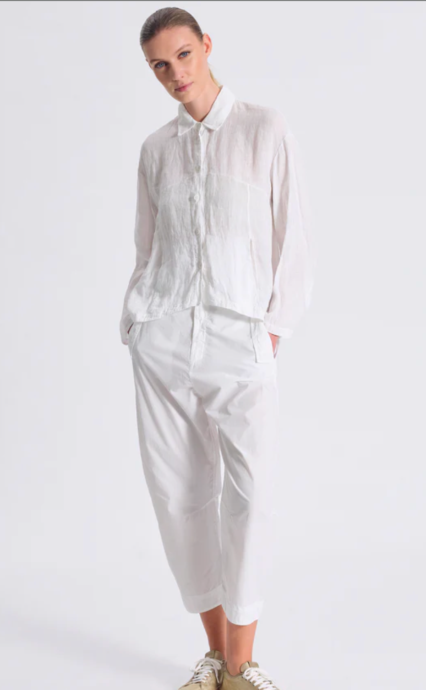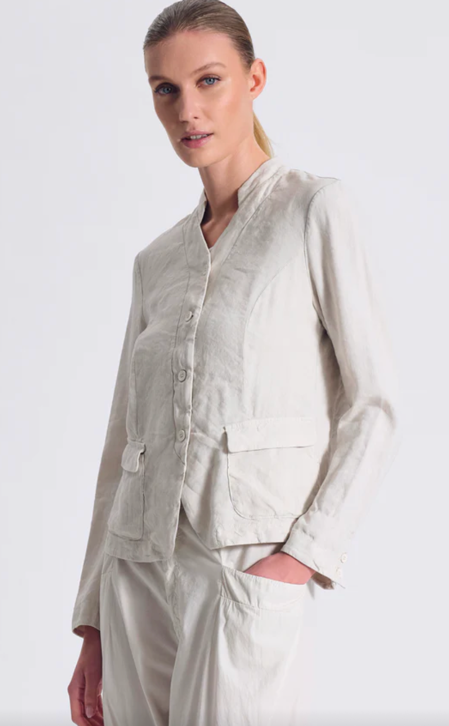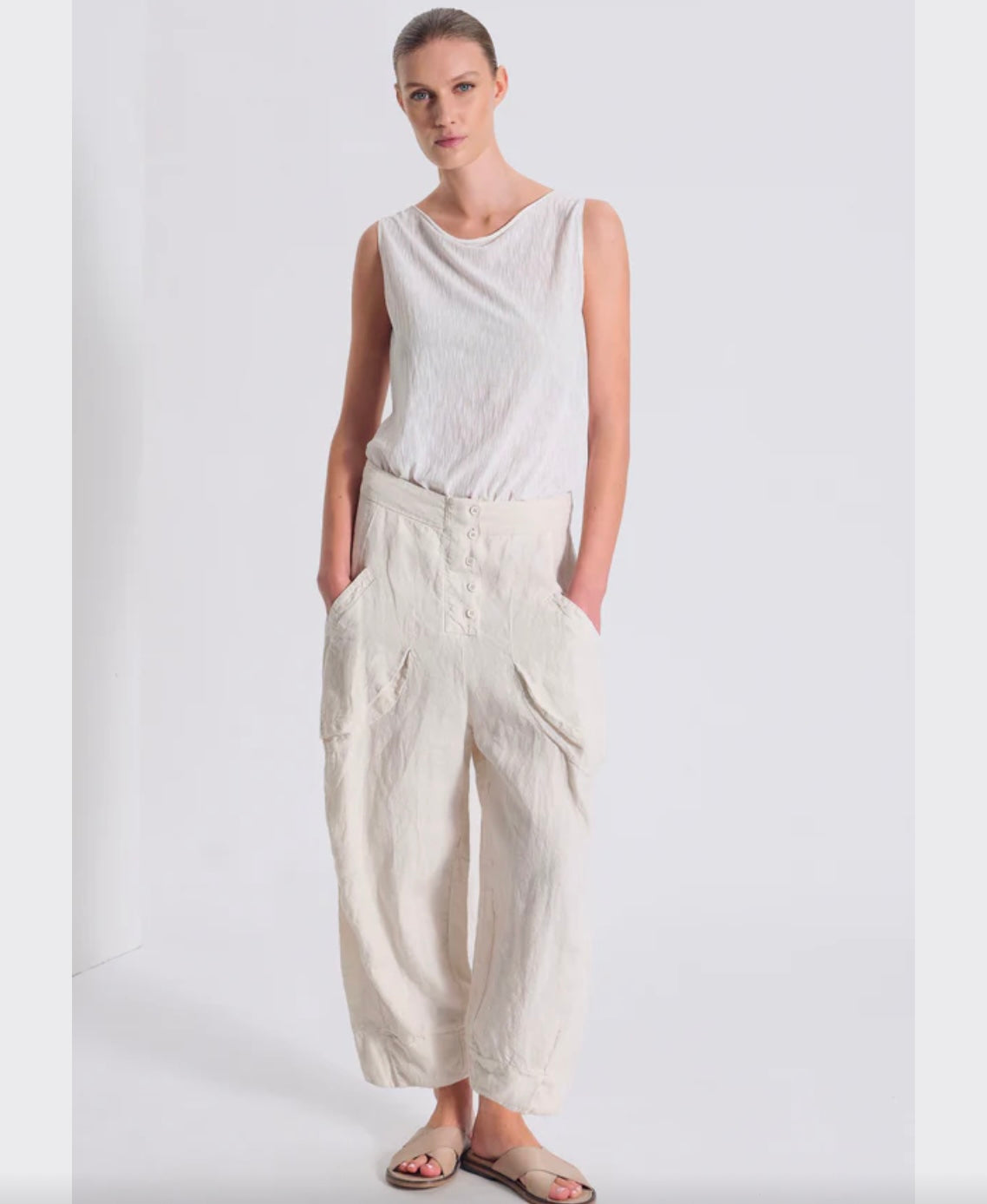 Regular price €298.00Transit Chalk 100% Linen Low Crotch Curved Leg Welt Flap Pocket Pant With Concealed Button Zip Detail.
